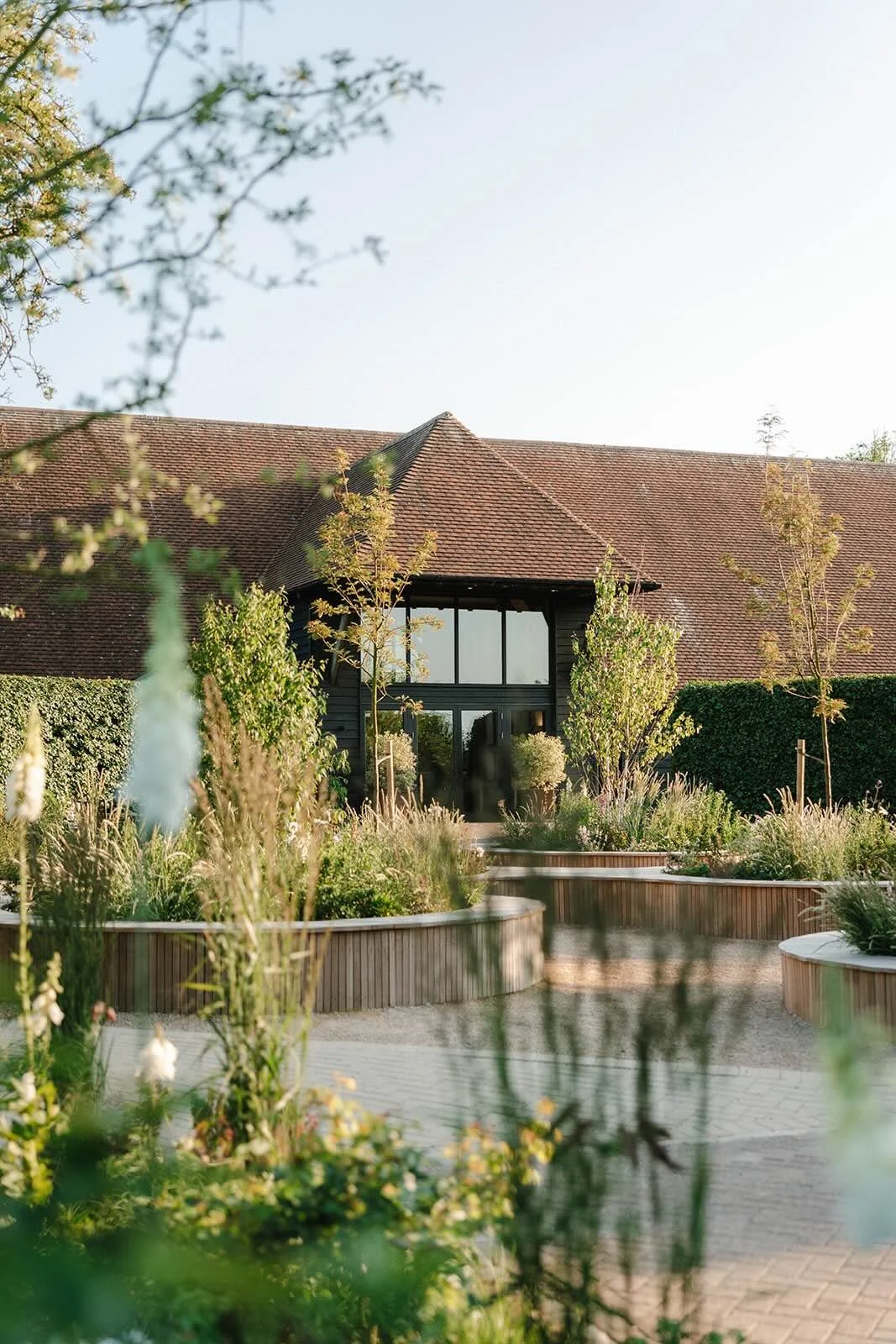 Garden ceremony framed by seasonal florals and open skies — with glass canopies built in for unpredictable weather.