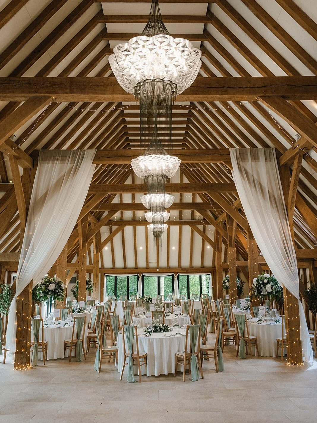 Marry under a starlit ceiling against a backdrop of cascading fabric and fairy lights with surround sound music, within a beautiful oak framed barn, as the sun leaves the sky.